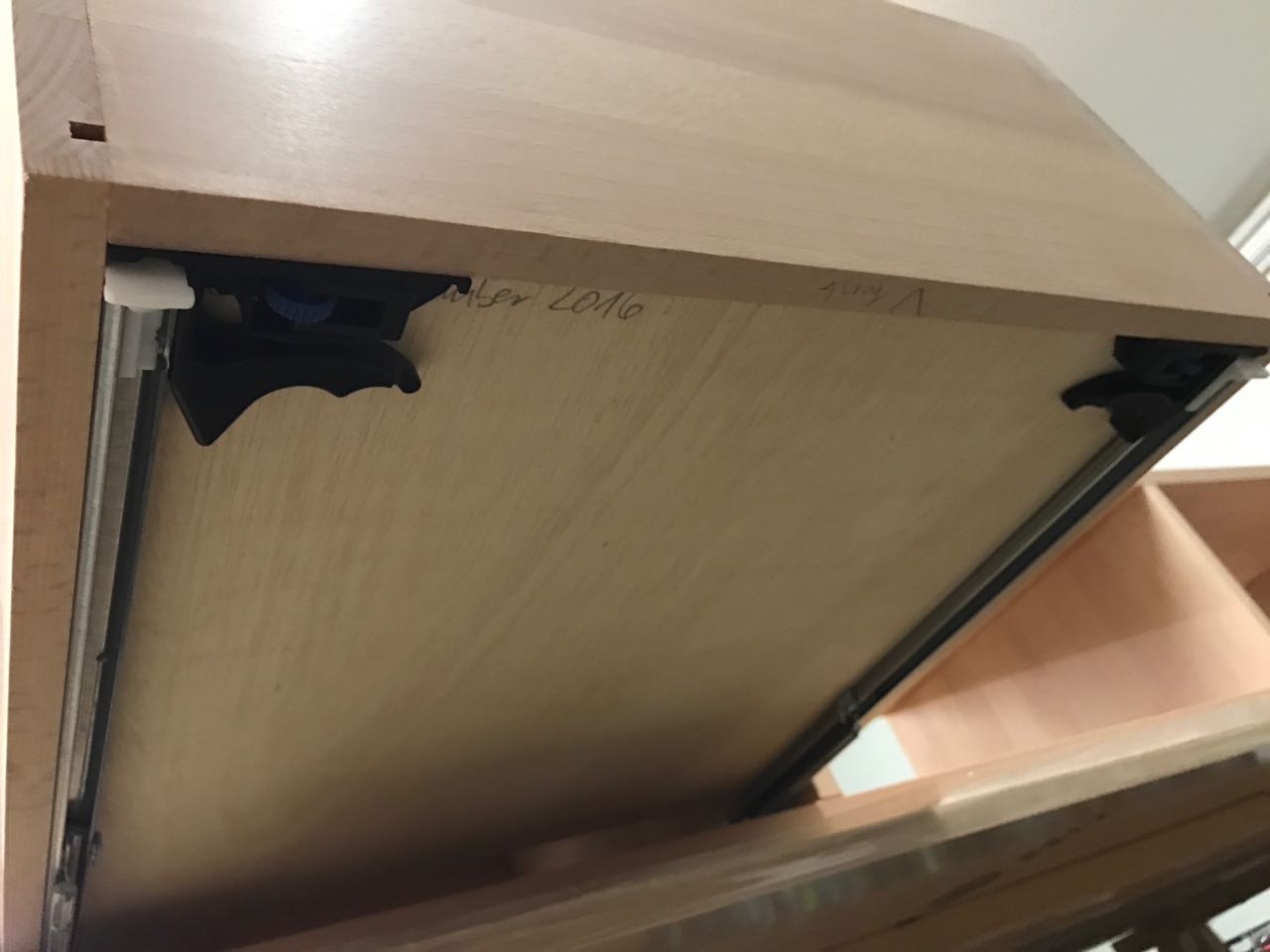 Die vorderen Schnäpper müssen deutlich hörbar einrasten. Hier ein Blick unter die Schublade mit den eingerasteten Schnäppern.