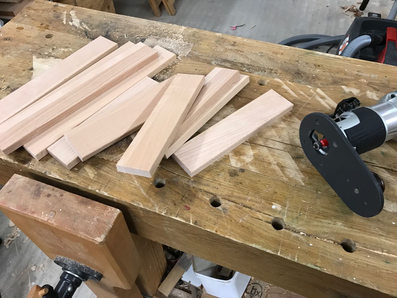 Hier kommt wieder 26mm Leimholz in einer Breite von 48mm zum Einsatz. Dieses wird entsprechend abgelängt und mit der kleinen Makita-Fräse und einem 2mm-Abrundfräser gerundet.