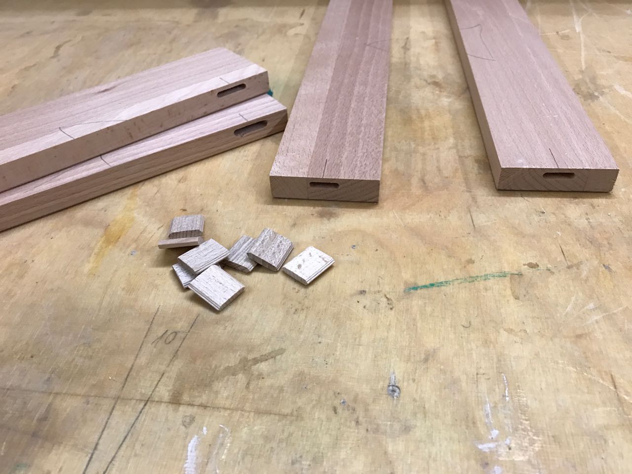 Diese Rundhölzer wurden nach dem Trocknen des Weißleims bündig mit der Japansäge abgesägt. Auf diesem Bild sieht man übrigens die im ersten Durchgang zu tief gefrästen Domino-Schlitze. Da diese aber an der Rückseite der inneren Seiten sind, ist das nicht weiter tragisch. Es ist aber eine bleibende Mahnung, beim Einsatz der Festool Domino-Fräse immer konzentriert zu sein und die richtigen Einstellungen zu machen.