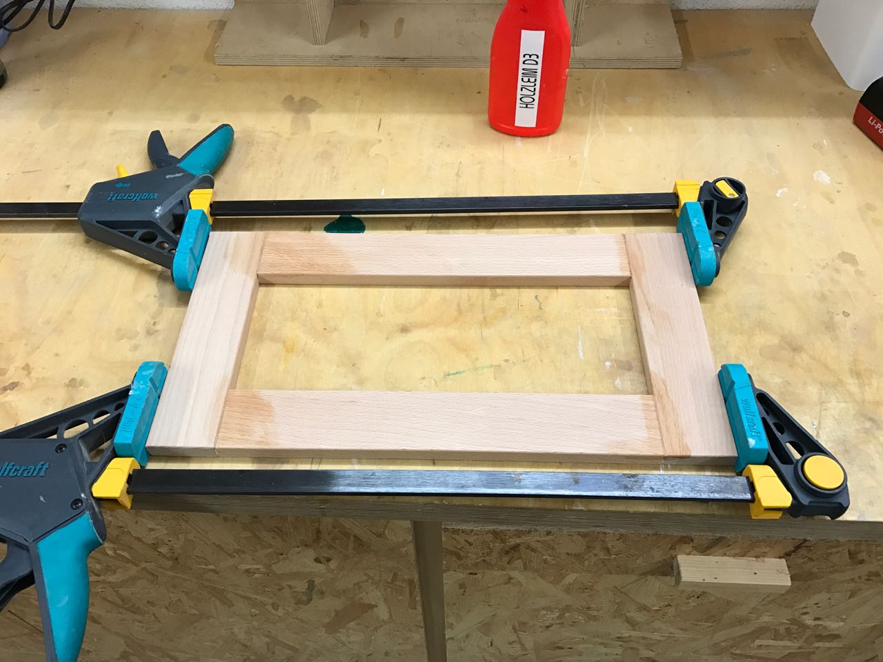 Überquellender Leim wird sofort mit einem feuchten Lappen abgewischt. Nun können die Rahmen in Ruhe über Nacht trocknen.