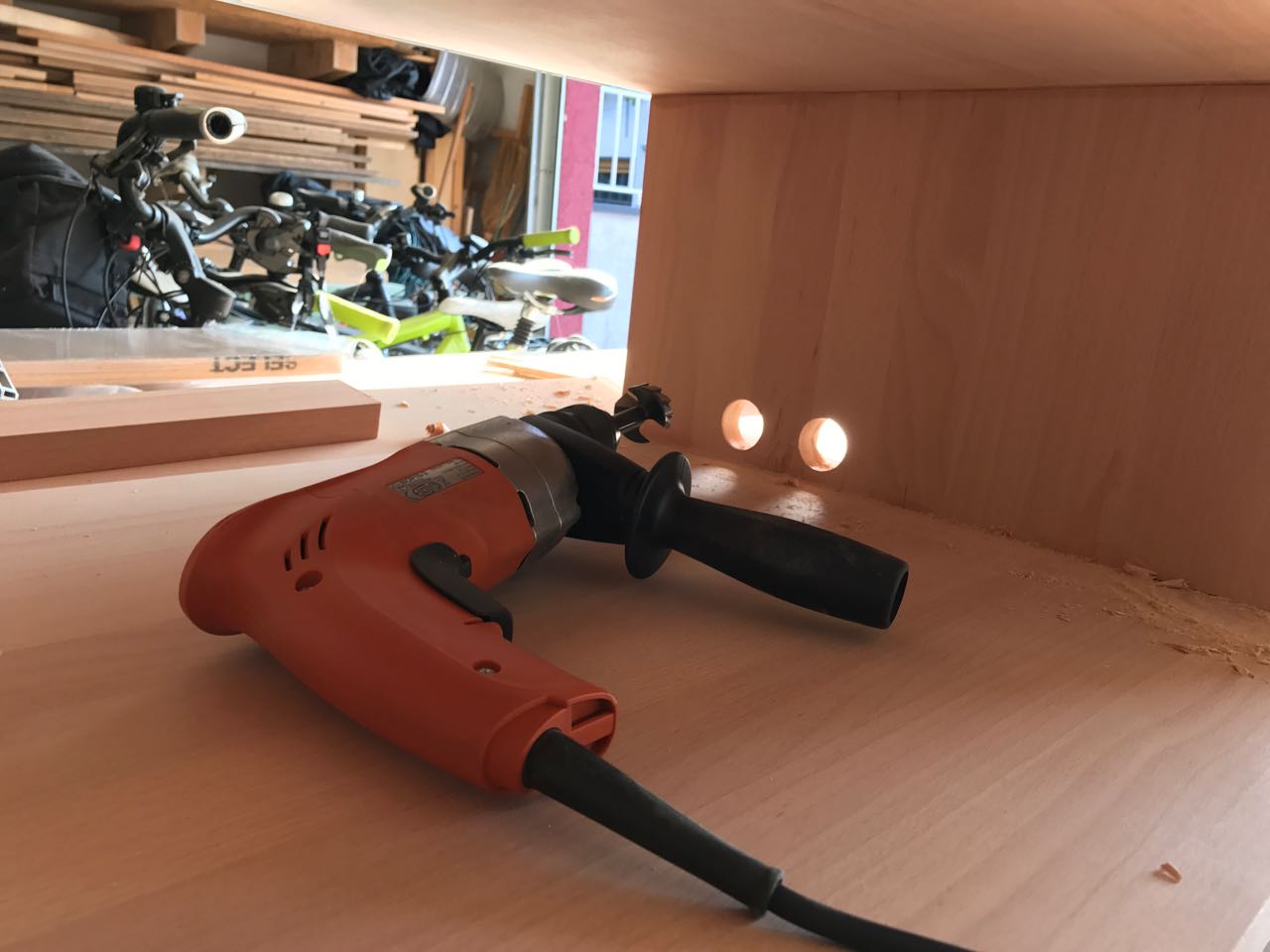 Weiterhin habe ich noch zwei Bohrungen von 35mm Druchmesser in die mittlere Trennwand eingebracht. So kann ich im Falle eines Falles später die Geräte in beiden Fächern des TV -LowBoards per Kabel miteinander verbinden.