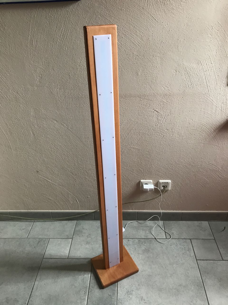 Ziel war es, eine LED Stehleuchte zu bauen, die in Punkto Material und Formgebung zu meinem in Arbeit befindlichen TV-Lowboad passt.