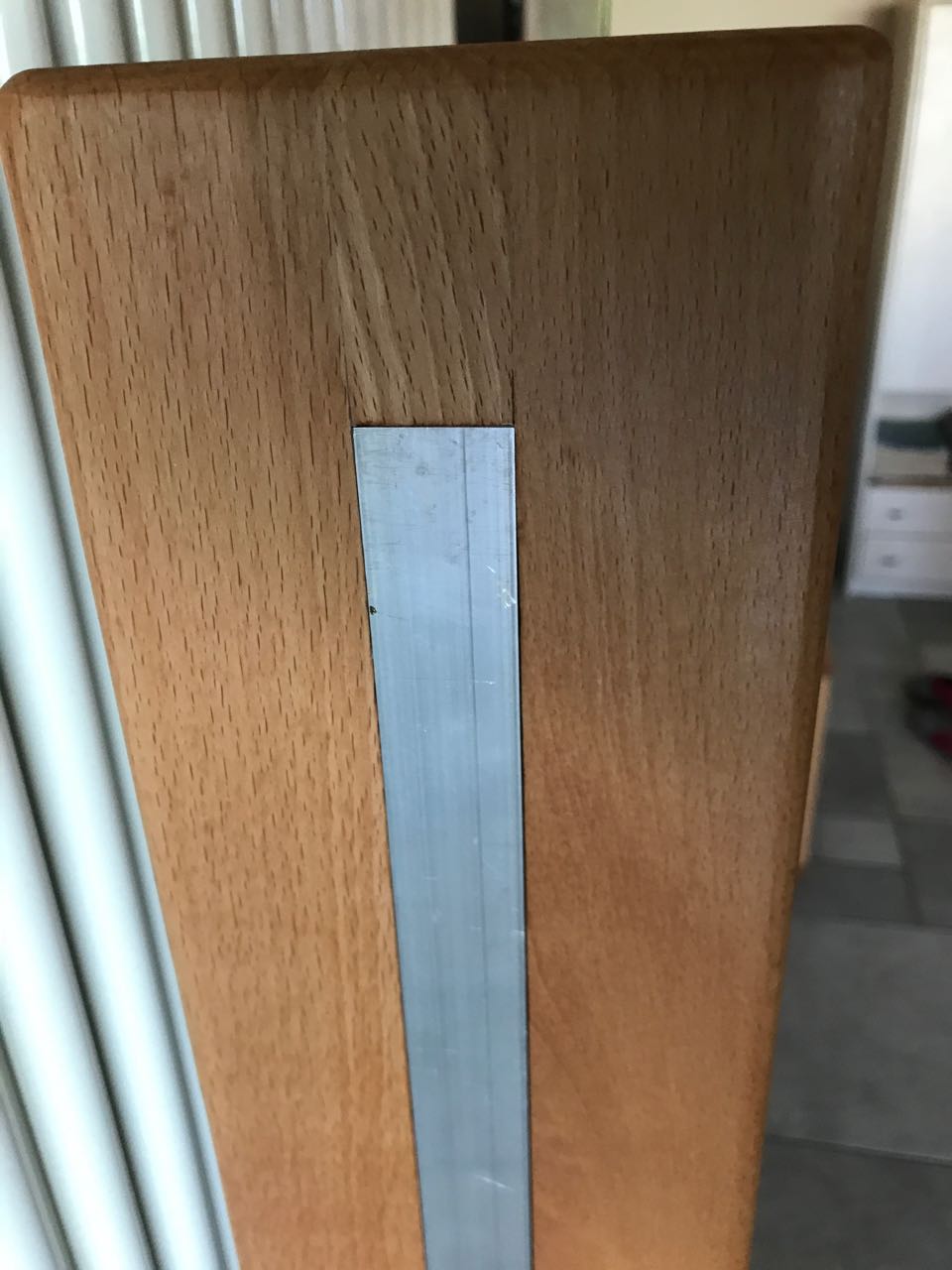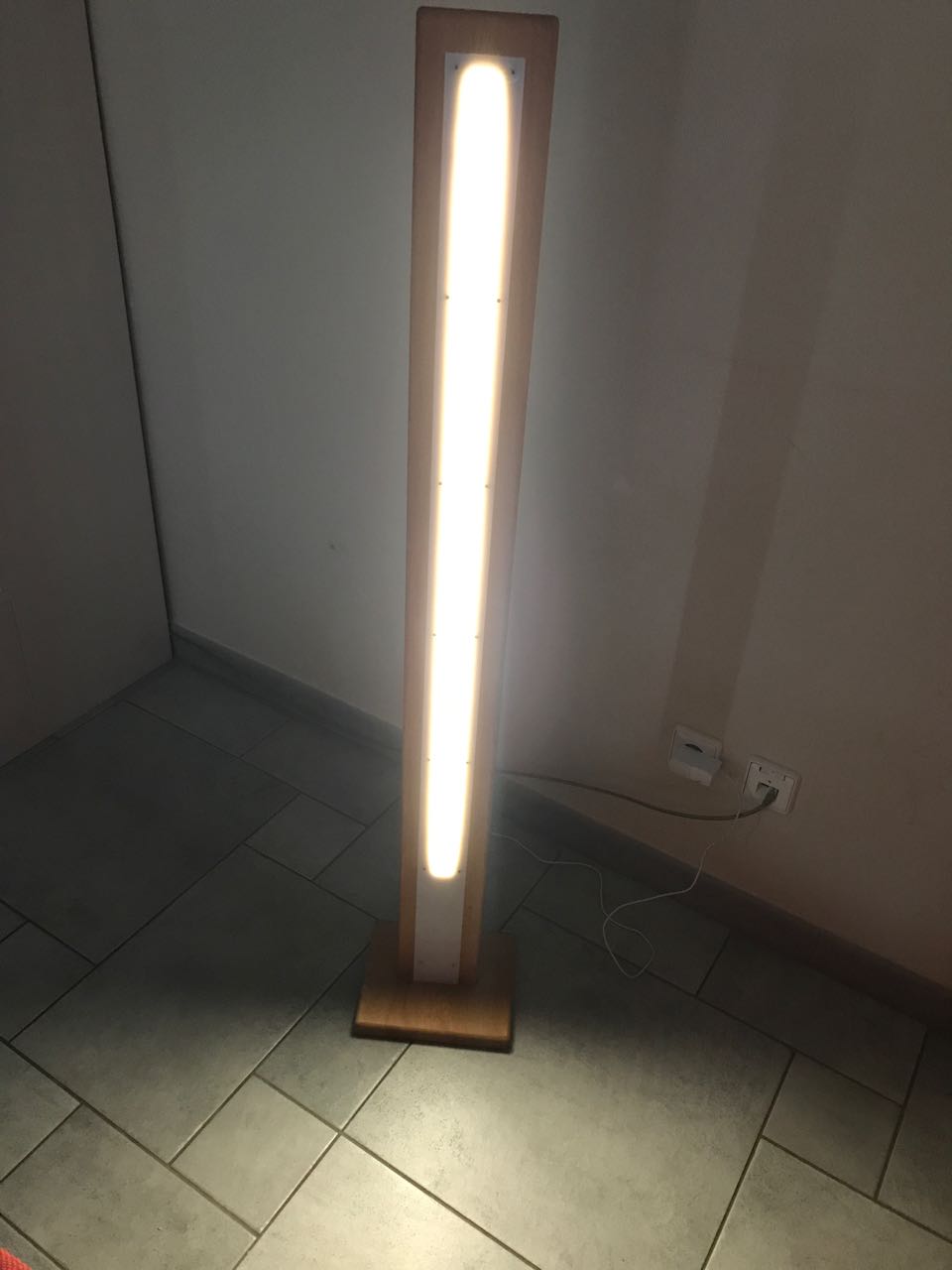 Die Leuchte selbst ist aus 26mm starkem Buchenleimholz gebaut, der Diffusor ist ein 2,5mm starkes, weißes Plexiglas. Das wird als Streifen über das Aluprofil geschraubt und gibt so ein angenehmes Streulicht ohne zu blenden.