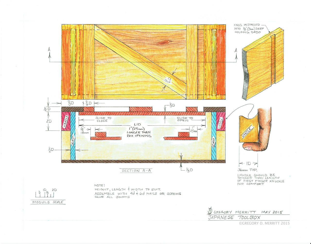 Auf dem Blog „Hillbillydaiku“ von Greg Merritt habe ich dann diesen Plan einer japanischen Werkzeugkiste gefunden, der mir als geistige Grundlage für dieses Projekt gedient hat.