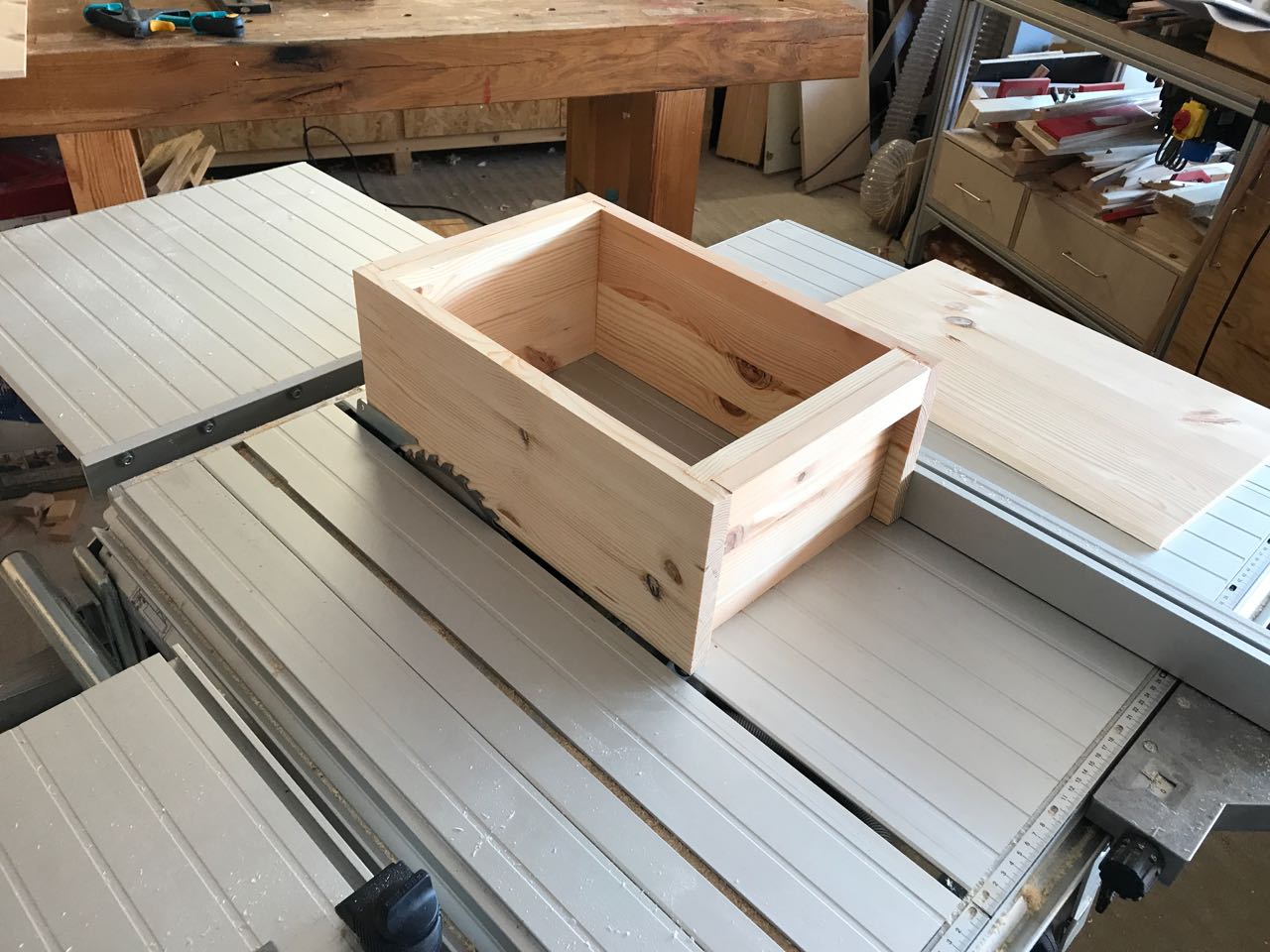 Mit der Tischkreissäge geht der Zuschnitt der vier Seitenteile schnell von der Hand. Wenn ein wenig mehr Zeit und Muße gewesen wäre, hätte ich hier sicher von Hand gearbeitet.
