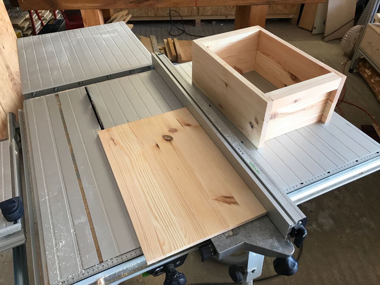 Um den Boden für die japanische Werkzeugkiste passgenau zuzusägen, wird der Korpus auf die Säge gelegt, der Längsanschlag an die Kiste geschoben und fixiert.