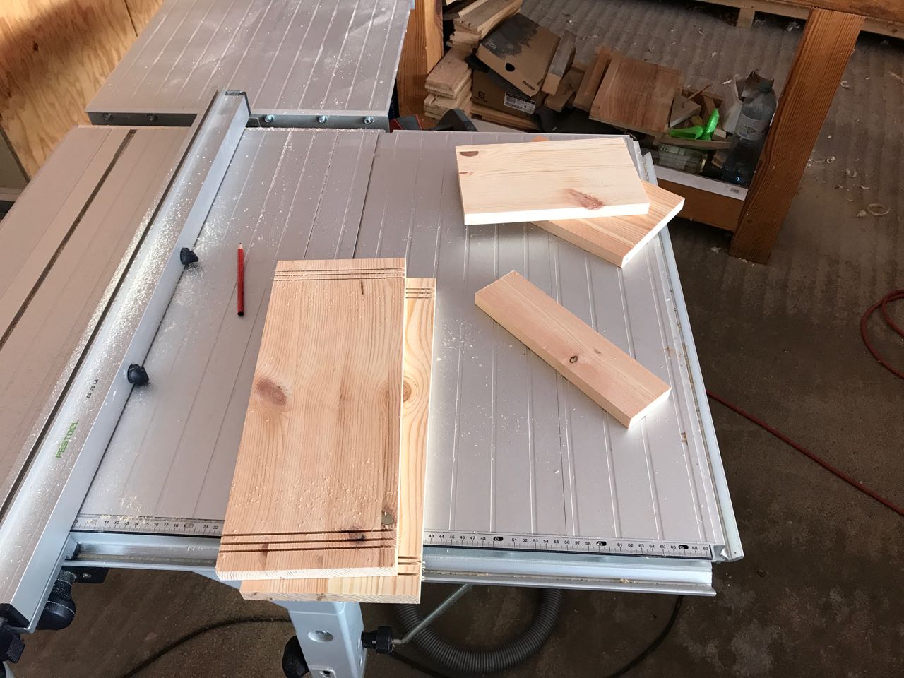 Deshalb habe ich auf ein vorhandenes Brett zurückgegriffen – 18mm starkes Kiefern-Leimholz, das noch vom Bau des skandinavischen Bücherregals übrig geblieben war.