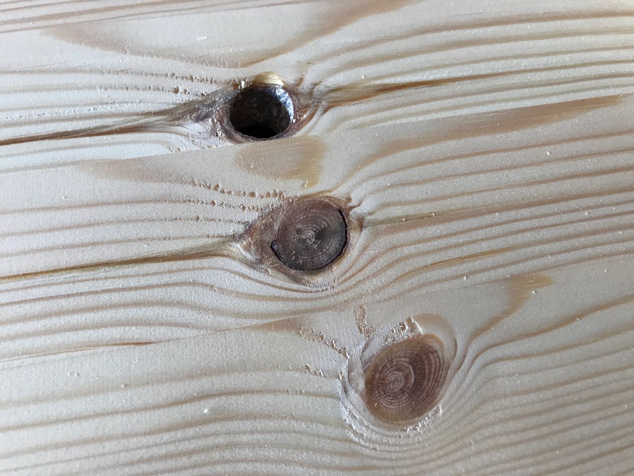 Natürlich ist beim Herunterhobeln des Leimholzes eines der Astlöcher aufgebrochen. Glücklicherweise konnte ich aber die Schnitte so legen, dass dieser Teil wegfällt.