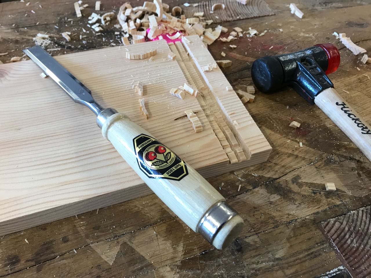 Die Nut wird dann mit dem 16mm Beitel herausgearbeitet. Bei dem weichen Kiefernholz kein großes Problem.