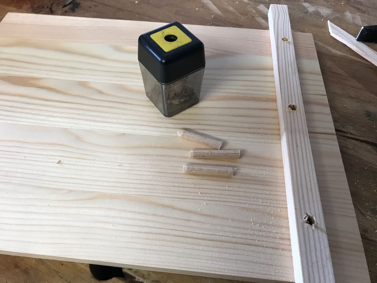 Da ich in dieser japanischen Werkzeugkiste keine Schrauben oder Nägel verwenden wollte, wurde alles mit 6mm Buchendübeln fixiert. Diese sind von einem 1m Stab abgesägt. Vor dem Einsetzen habe ich die Dübel mit dem Bleistiftspitzer angefast. So lassen sie sich problemlos in die Bohrungen hämmern.
