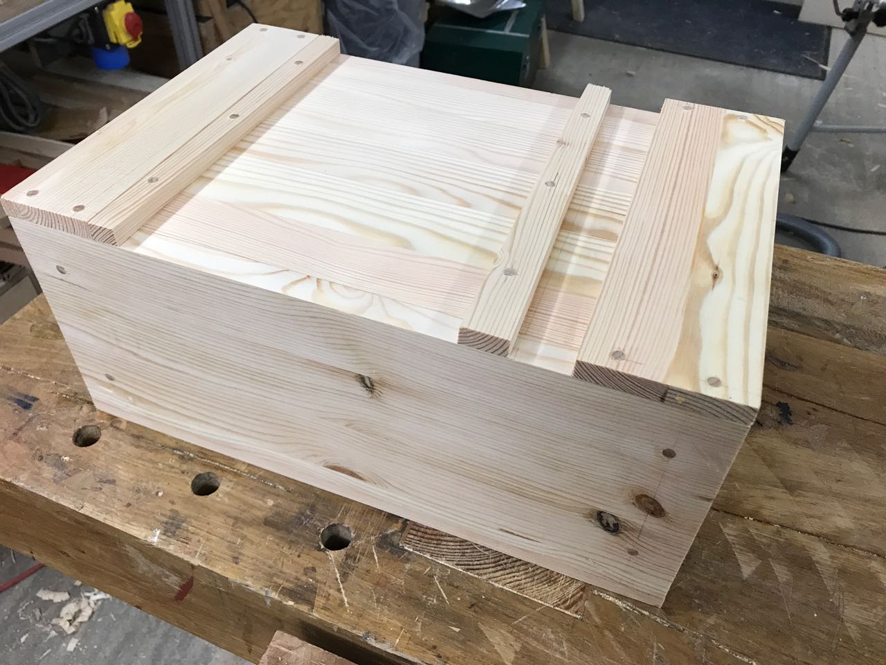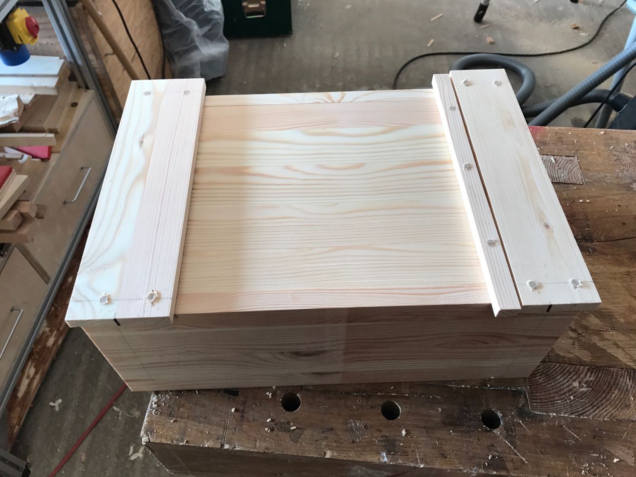 Nachdem die oberen Querhölzer aufgeleimt und getrocknet waren konnte der Deckel abgelängt werden.
