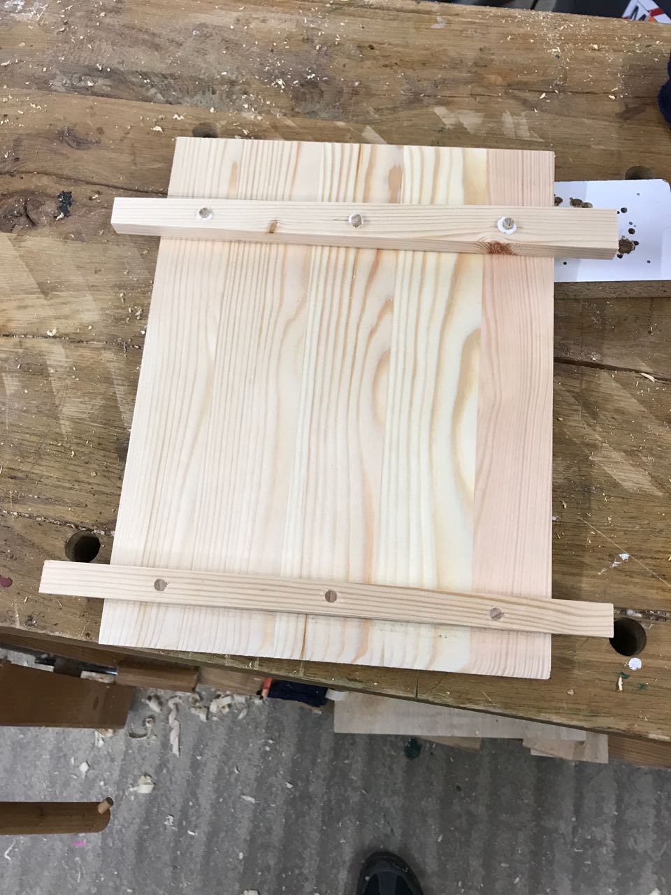 Wenn alles passt, kann der zweite Querträger aufgeleimt und festgedübelt werden. Dieser Träger ist dabei mit ca. 10 Grad verjüngt. Später kann hier die japanische Werkzeugkiste mit einem Keil während des Transports verschlossen werden.