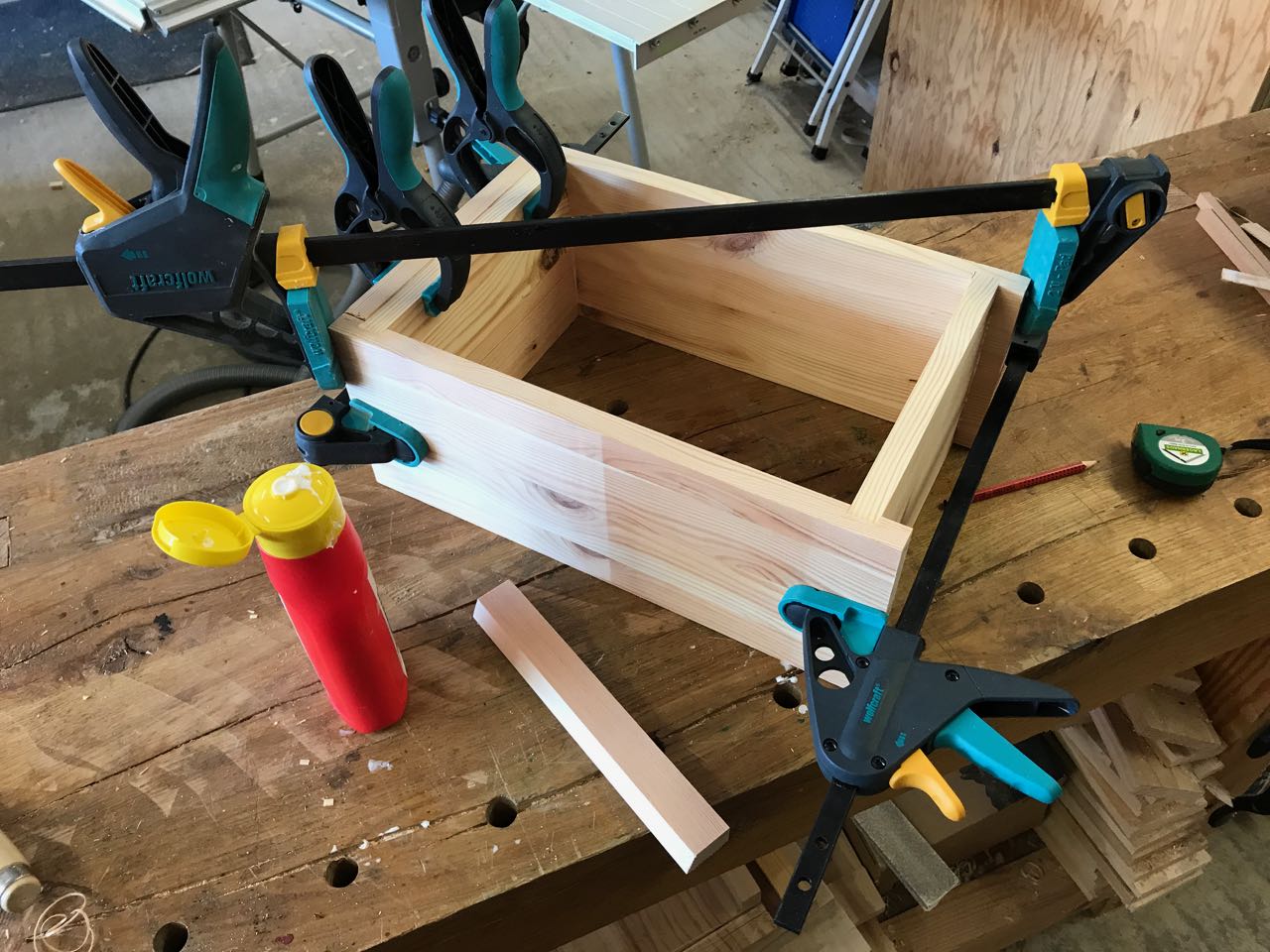 Nach dem Auftragen des Leims wird alles mit den bewährten Wolfcraft Einhandzwingen fixiert und ausgerichtet.