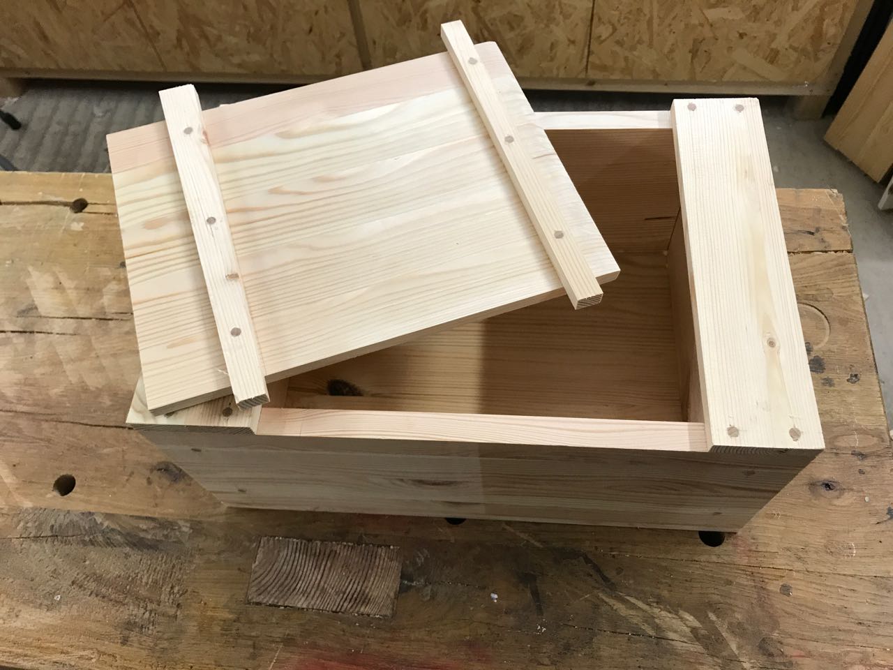 Das Ermitteln der optimalen Länge des Deckels erfolgt am besten wieder direkt an der Kiste. Dazu wird der erste Querträger aufgeleimt.
