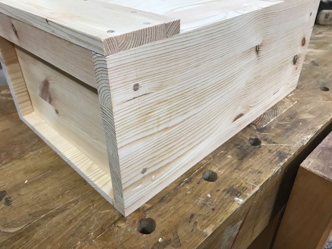 Beim Deckel sind die Bohrungen senkrecht, um die Ausrisse an der Unterseite zu minimiren, aber beim Korpus der Kiste sind die Bohrungen immer wechselweise schräg gesetzt.