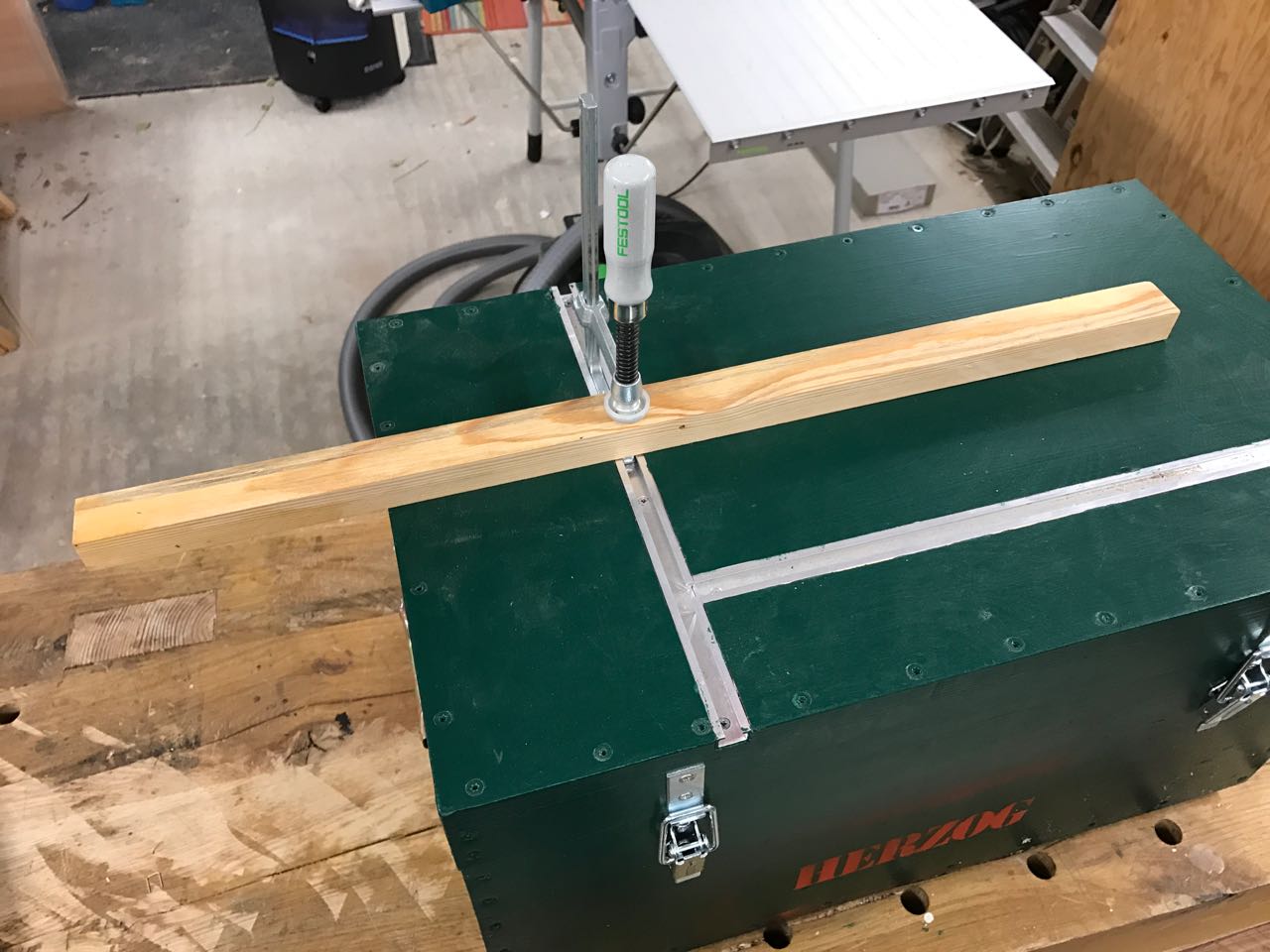 Die Kiste war für den schnellen Einsatz „rund ums Haus“ gedacht. Um dabei auch mal ein Werkstück festspannen zu können habe ich diese Werkzeugkiste oben mit Nutschienen versehen.