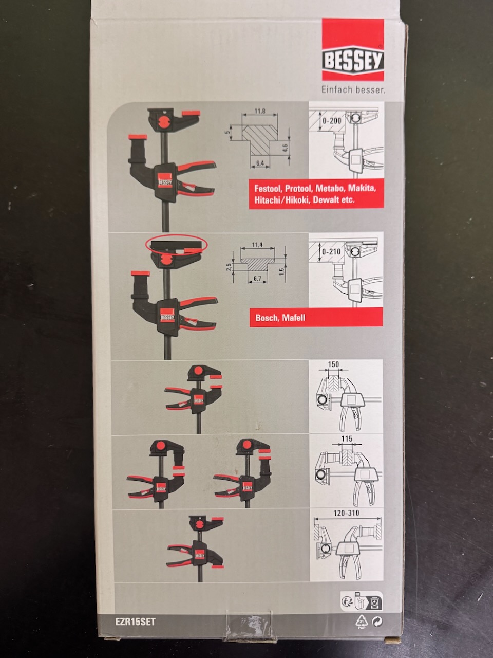 Habe die Bessey-Zwingen vor ein paar Jahren gekauft und nutze sie gelegentlich bei den Führungsschienen. Damals wurde sie noch ohne Adapter für Bosch/Maffel verkauft. Ich habe auch ein paar der Piher-Zwingen für Führungsschienen – inzwischen modifiziert – die auch zum Microjig MatchFit Schwalbenschwanz-Nuten passen können – siehe Blogeintrag. Auch wenn die beiden Schienen nicht direkt vergleichbar sind, die Piher ist inzwischen meine erst Wahl.
