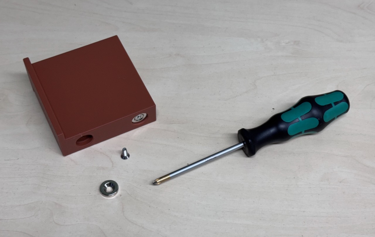 Es kommen 15x3mm Scheibenmagnete mit Loch zum Einsatz, die ich von Magnetmax.de bezogen habe. . Die Verschraubung erfolgt mit Senkkopfschrauben M4x12 (weil ich die gerade zur Hand hatte) Es geht hier so ziemlich jede M4 Senkkopfschraube im Bereich von M4x8 bis M4x15.