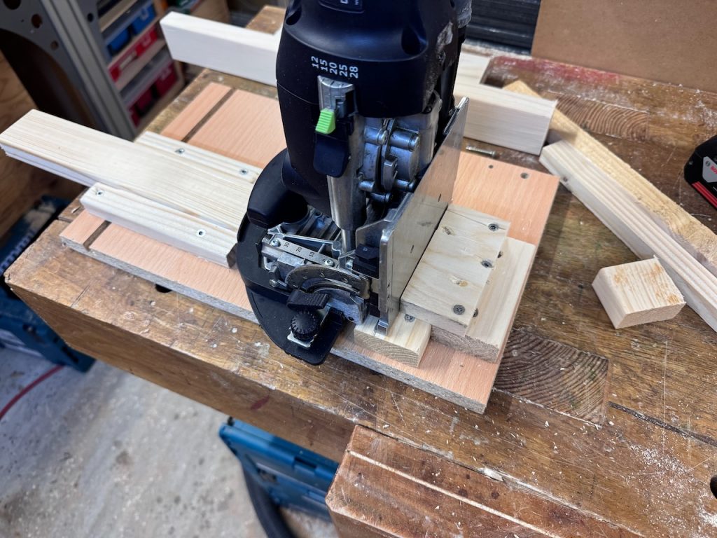 Um eine gefälligere Optik der Rahmenteile zu bekommen, habe ich daher zur Festool Domino-Fräse gegriffen. Um hier möglichst identische Fräsungen an allen Teilen mit einer Färbung in der Längsseite zu bekommen, wurde aus ein paar Holzresten eine einfache Schablone zusammengeschraubt. Darin werden die einzelnen Hölzer platziert und gefräst.