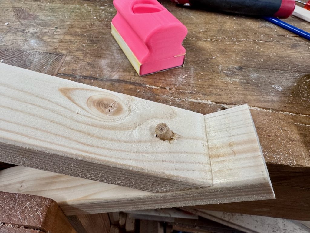 Da ich mich bei der unteren Diagonalstrebe nicht nur auf den Klebekraft des Holzleims verlassen wollte, habe ich an der vertikalen Klebestelle einen 6mm Buchenholzrundstab eingeklebt.