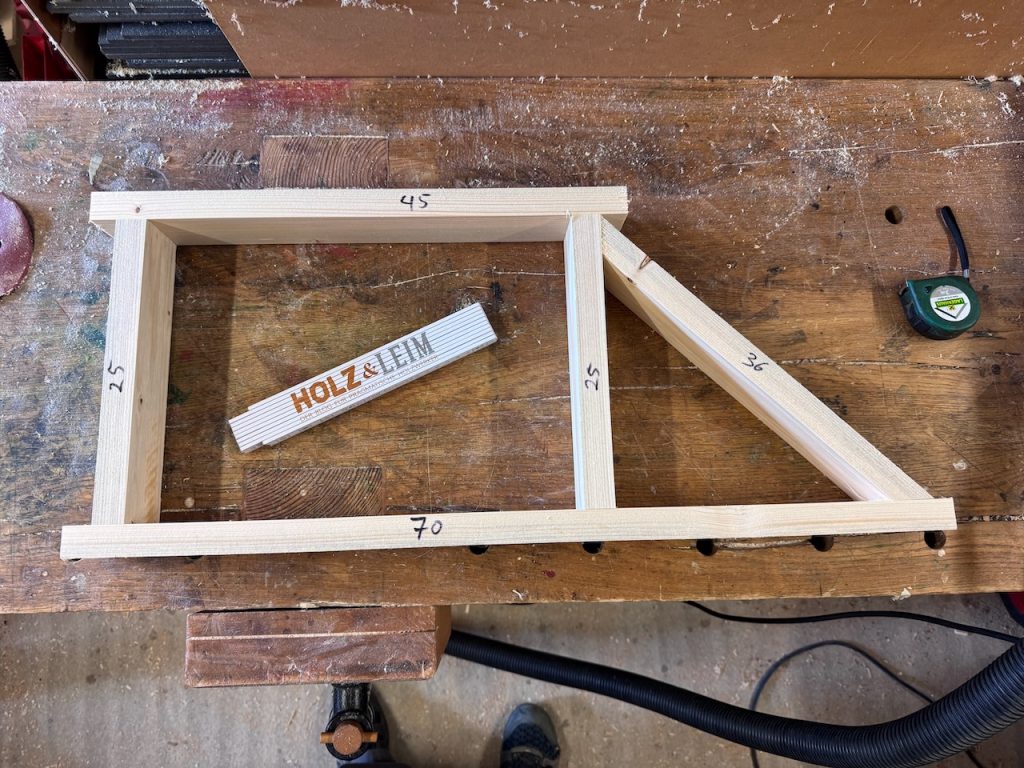 Nun geht es darum, die Länge des unteren Diagonalträgers zu ermitteln. Dazu wird zunächst an einem Ende mit 45 Grad abgeschrägt, dann durch Anlagen eines Rahmens die Schnittlänge ermittelt.