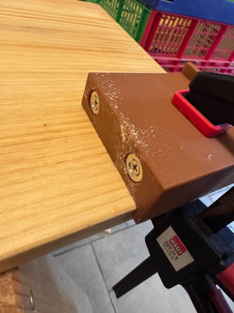 Die Hölzer mit Stirnfräsungen wurden mit einer Wolfcraft Einhand-Zwinge auf der Hobelbank fixiert. Wie das geht? Einfach den gelben Knopf drücken, Kopf abziehen, Zwinge von unten durch das Loch in der Hobelbank stecken, Kopf wieder aufsetzen und einrasten. Fertig.