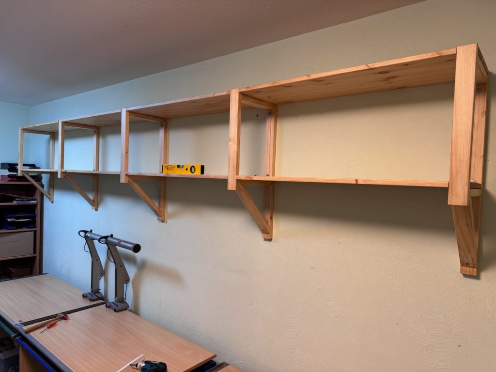 Es wurden Wandregale für die Reorganisation meiner kleinen 3D-Druckwerkstatt benötigt. Da der Raum auf einer Seite bereits mit Lundia-Regalen ausgestattet ist, sollte das Wandregal optisch dazu passen. Daher habe ich geplant, die Regalträger wieder aus Fichtenrahmen zu bauen, ähnlich wie ich dies bereits beim Projekt „Skandinavisches Bücherregal“ getan hatte.