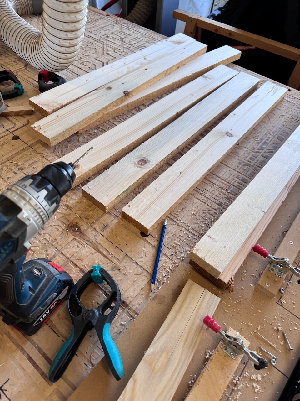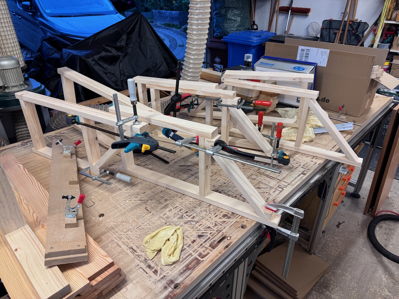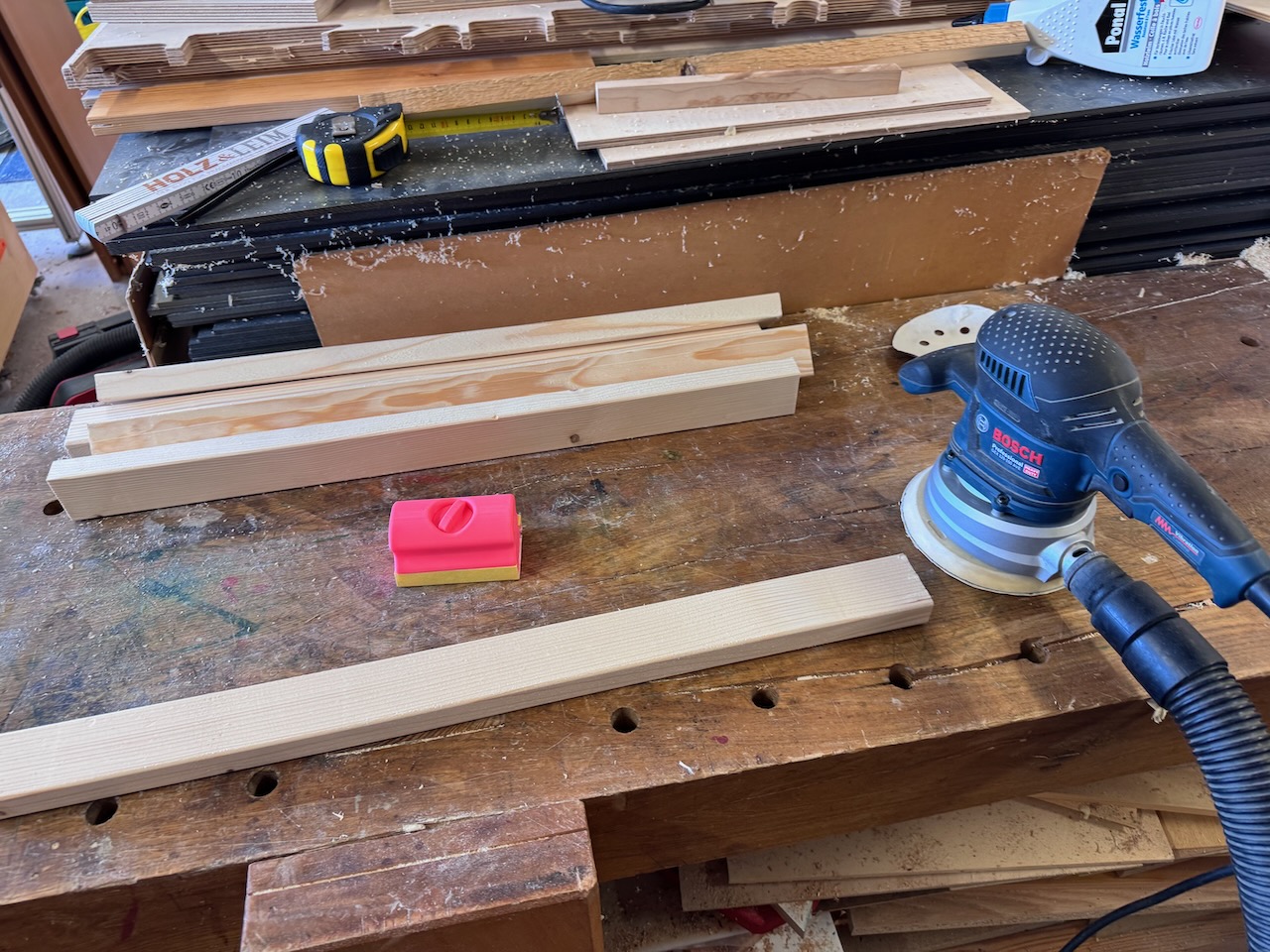 Um wieder etwas Platz in meiner Werkstatt zu bekommen, habe ich beschlossen, hier auf Holz aus meinem Bestand zurückzugreifen. Vom einer Holz-Recycling-Aktion Ende 2024 hatte ich noch eine ganze Menge Fichtenkanthölzer mit einem Querschnitt von ca. 68×35 in Werkstatt stehen.