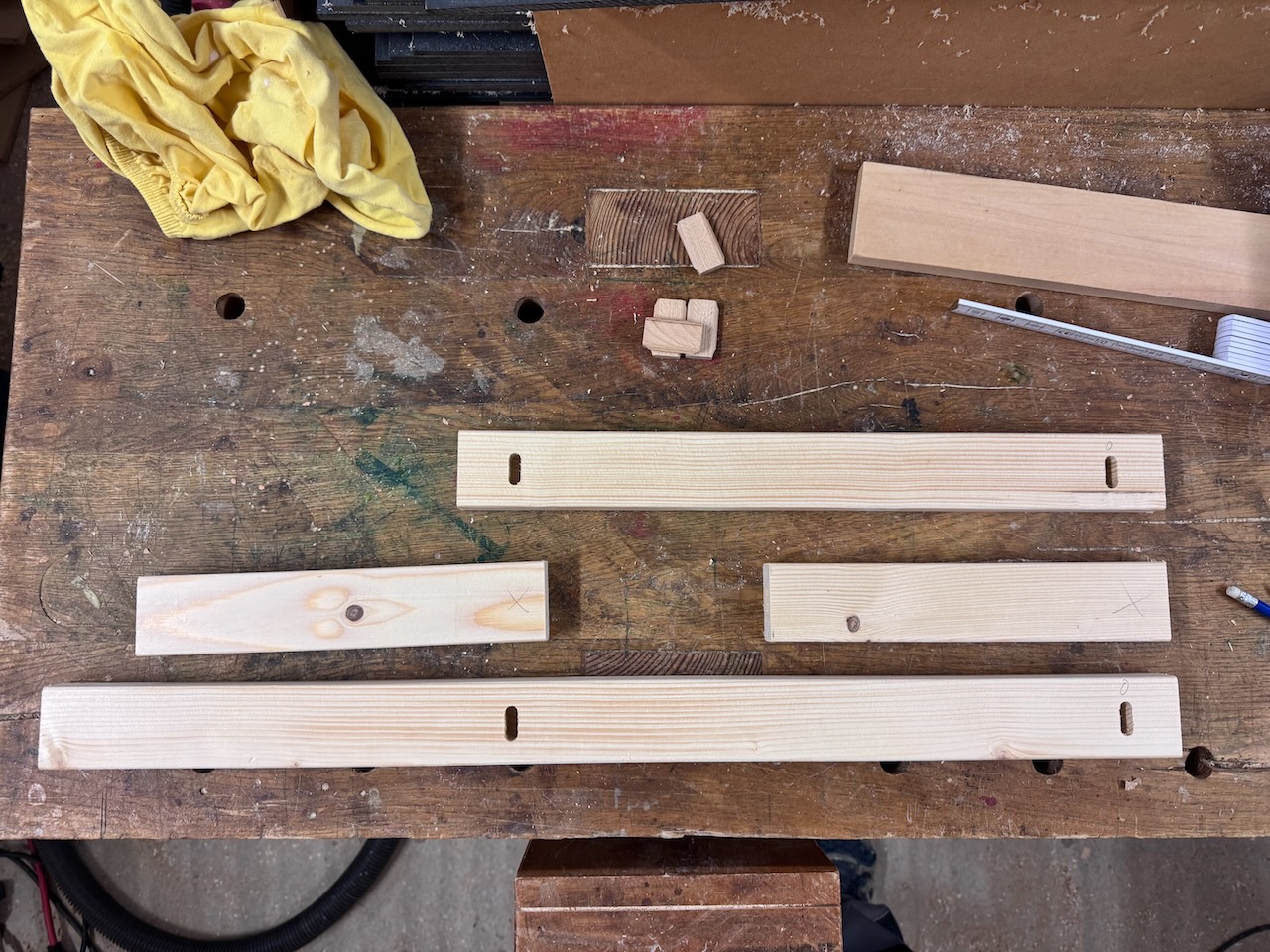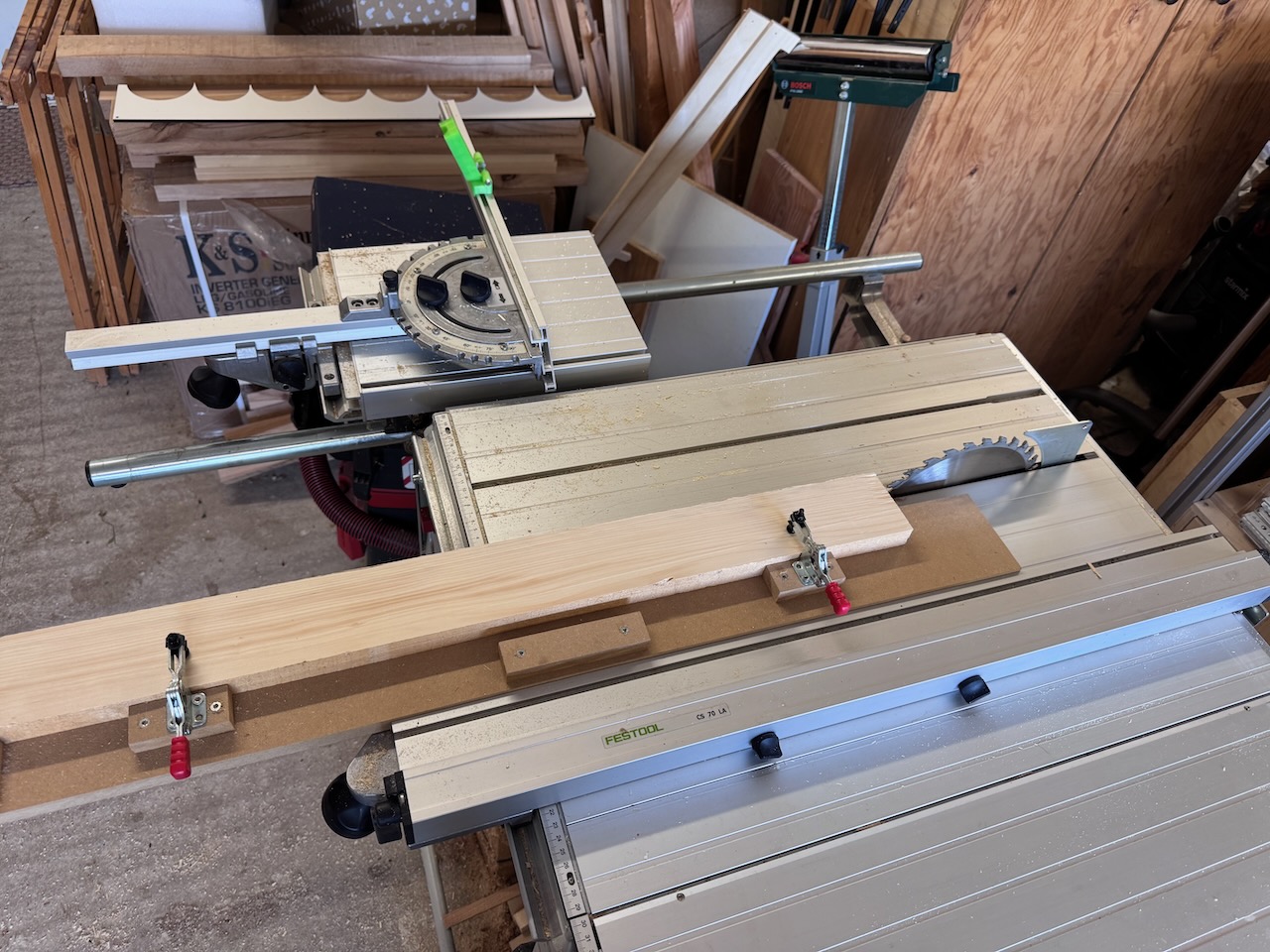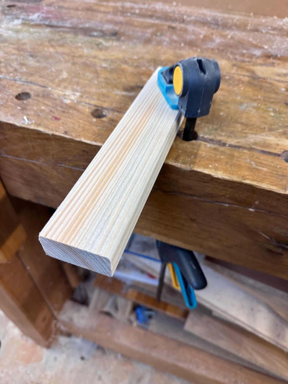 Um wieder etwas Platz in meiner Werkstatt zu bekommen, habe ich beschlossen, hier auf Holz aus meinem Bestand zurückzugreifen. Vom einer Holz-Recycling-Aktion Ende 2024 hatte ich noch eine ganze Menge Fichtenkanthölzer mit einem Querschnitt von ca. 68×35 in Werkstatt stehen.