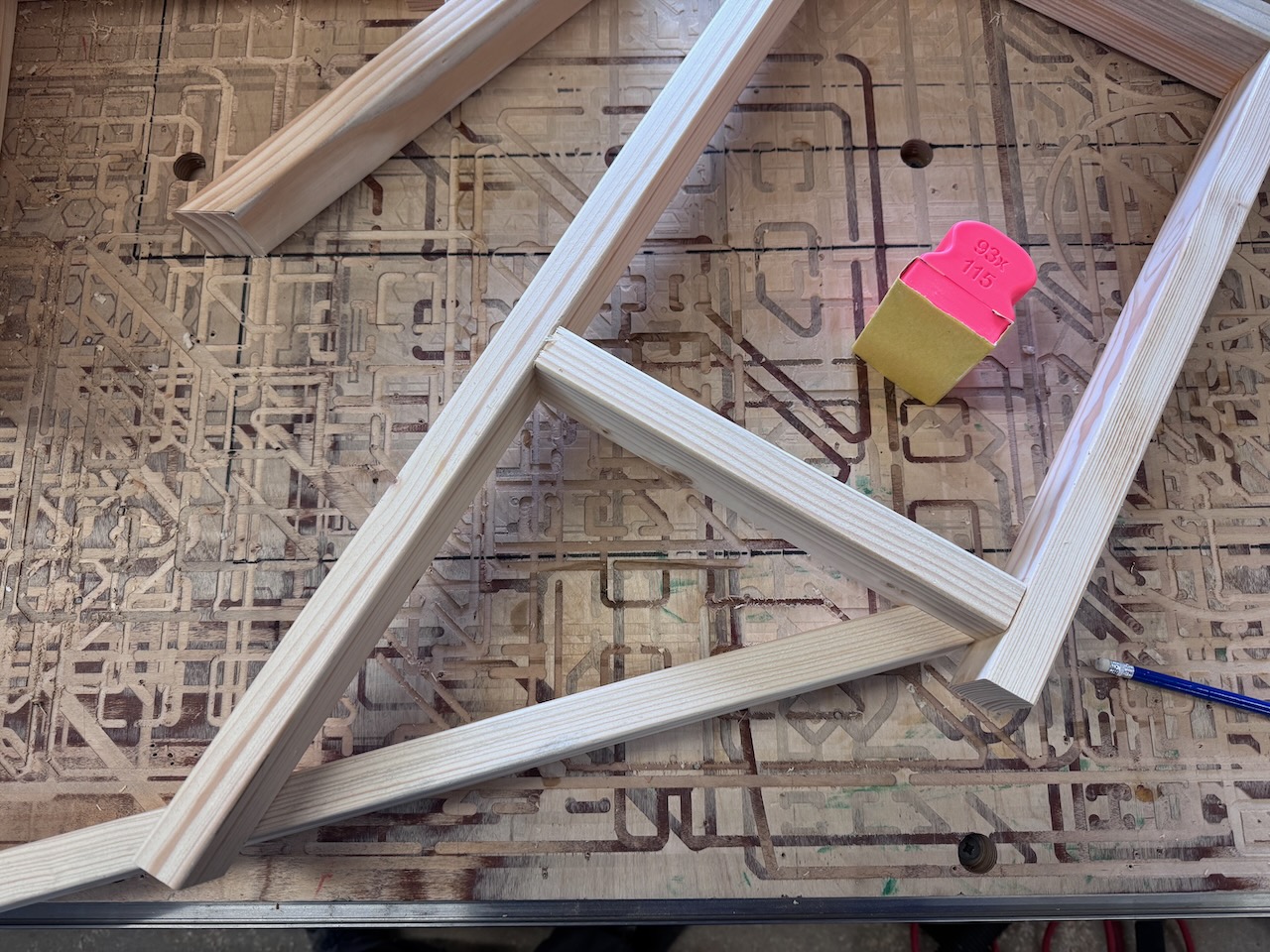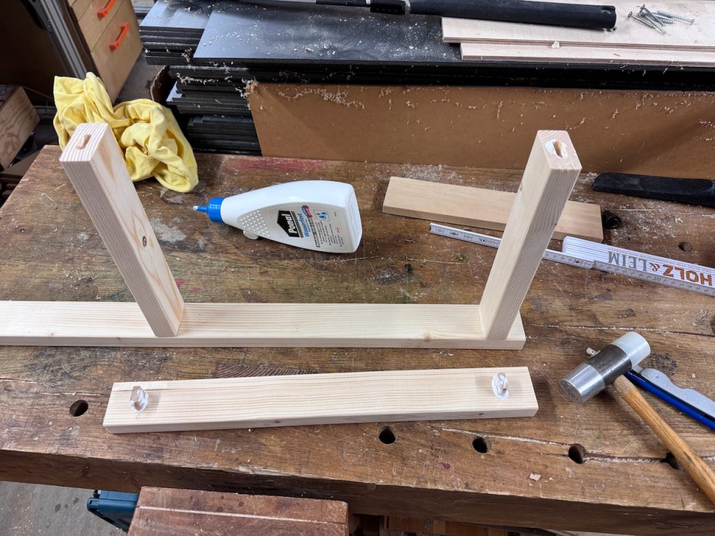 Da ich mich bei der unteren Diagonalstrebe nicht nur auf den Klebekraft des Holzleims verlassen wollte, habe ich an der vertikalen Klebestelle einen 6mm Buchenholzrundstab eingeklebt.
