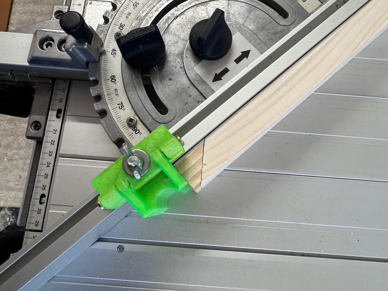 Um beide 45 Grad Schnitte auch an der Tischkreissäge exakt reproduzierbar zu haben, wird das diagonal zugesagte Ende beim Anlegen mit einem Reststück unterfüttert.