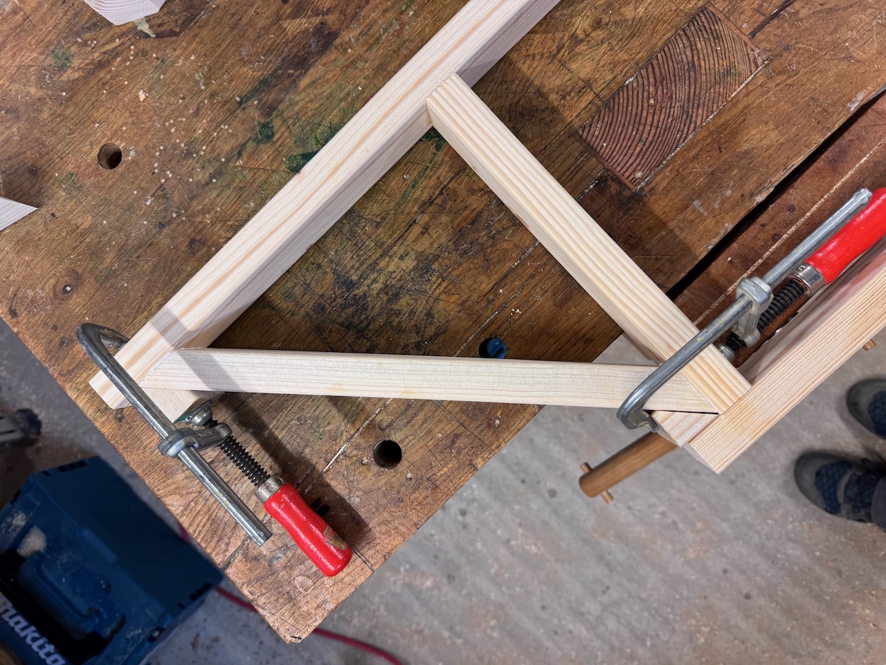 Es werden zunächst die Rahmenteile für den rechteckigen Teil zusammengebaut. Dabei wird darauf geachtet, dass alles rechtwinklig und ohne Verzug verleimt wird.