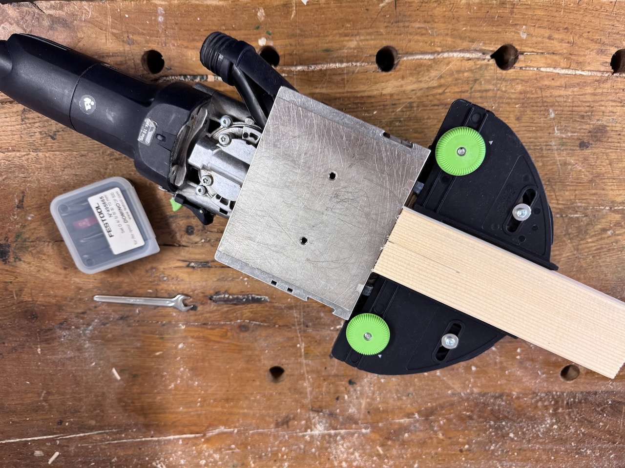 Um eine gefälligere Optik der Rahmenteile zu bekommen, habe ich daher zur Festool Domino-Fräse gegriffen. Um hier möglichst identische Fräsungen an allen Teilen mit einer Färbung in der Längsseite zu bekommen, wurde aus ein paar Holzresten eine einfache Schablone zusammengeschraubt. Darin werden die einzelnen Hölzer platziert und gefräst.