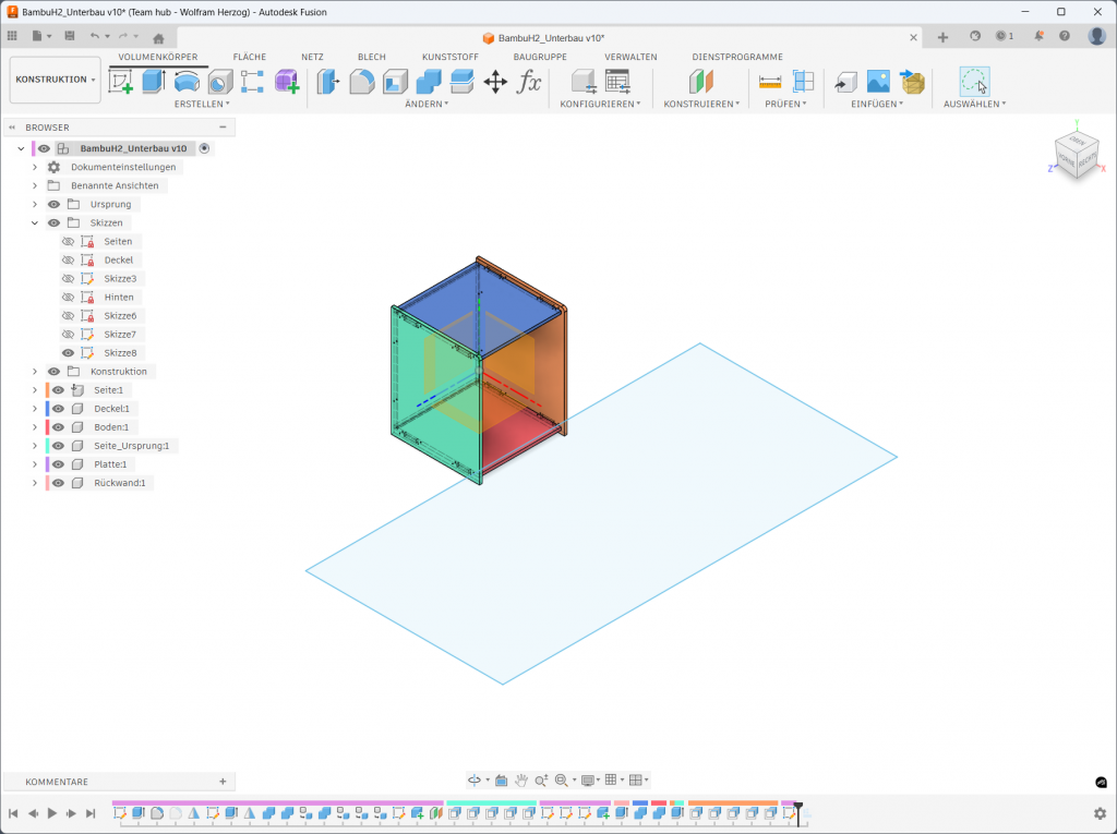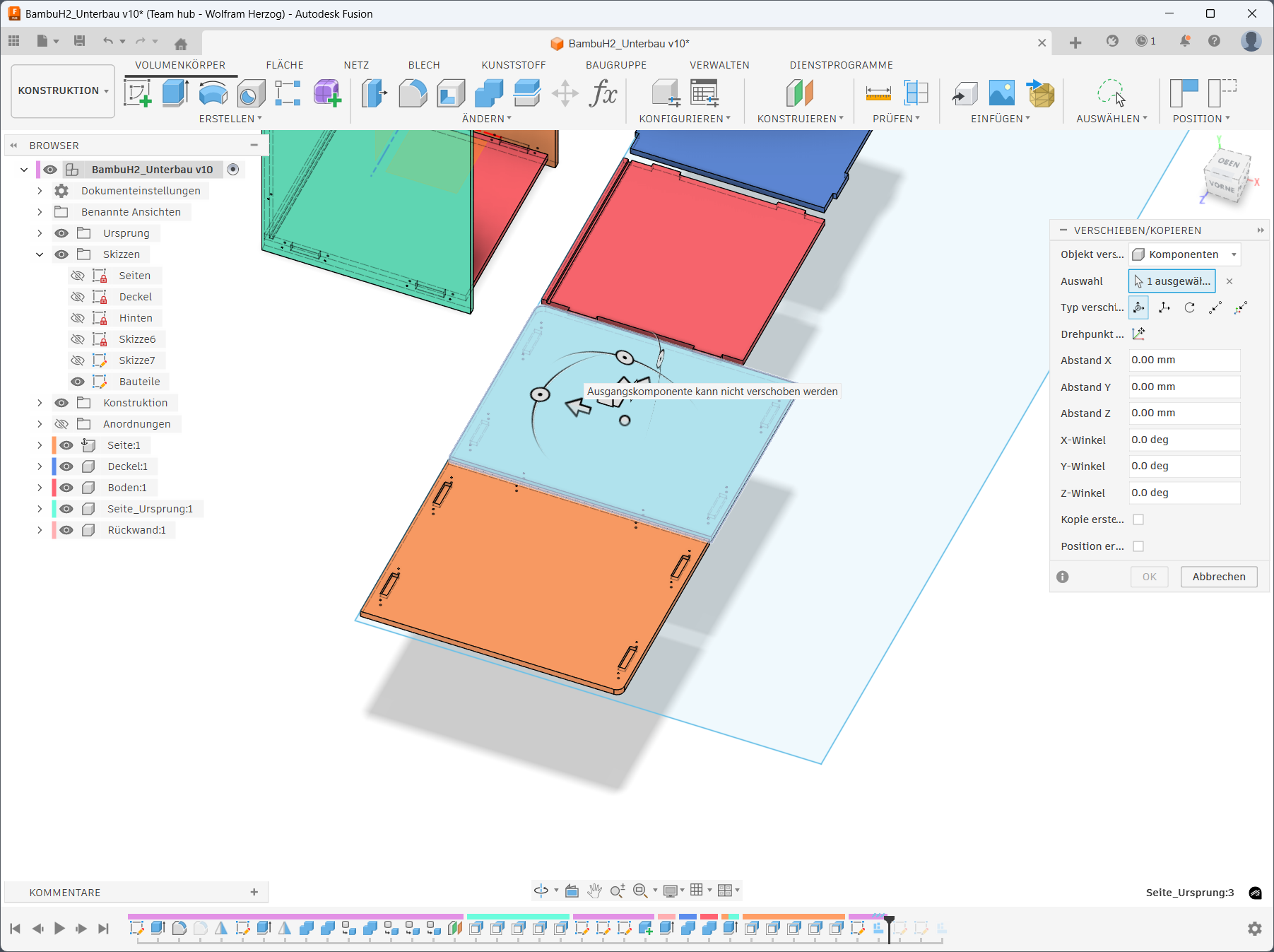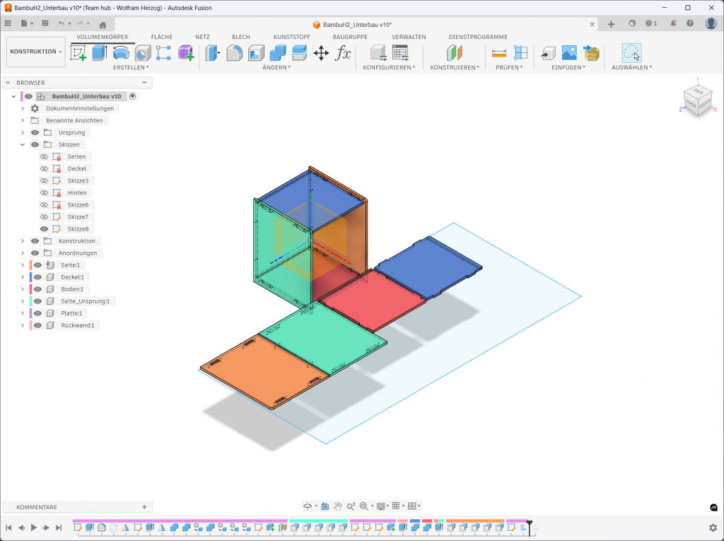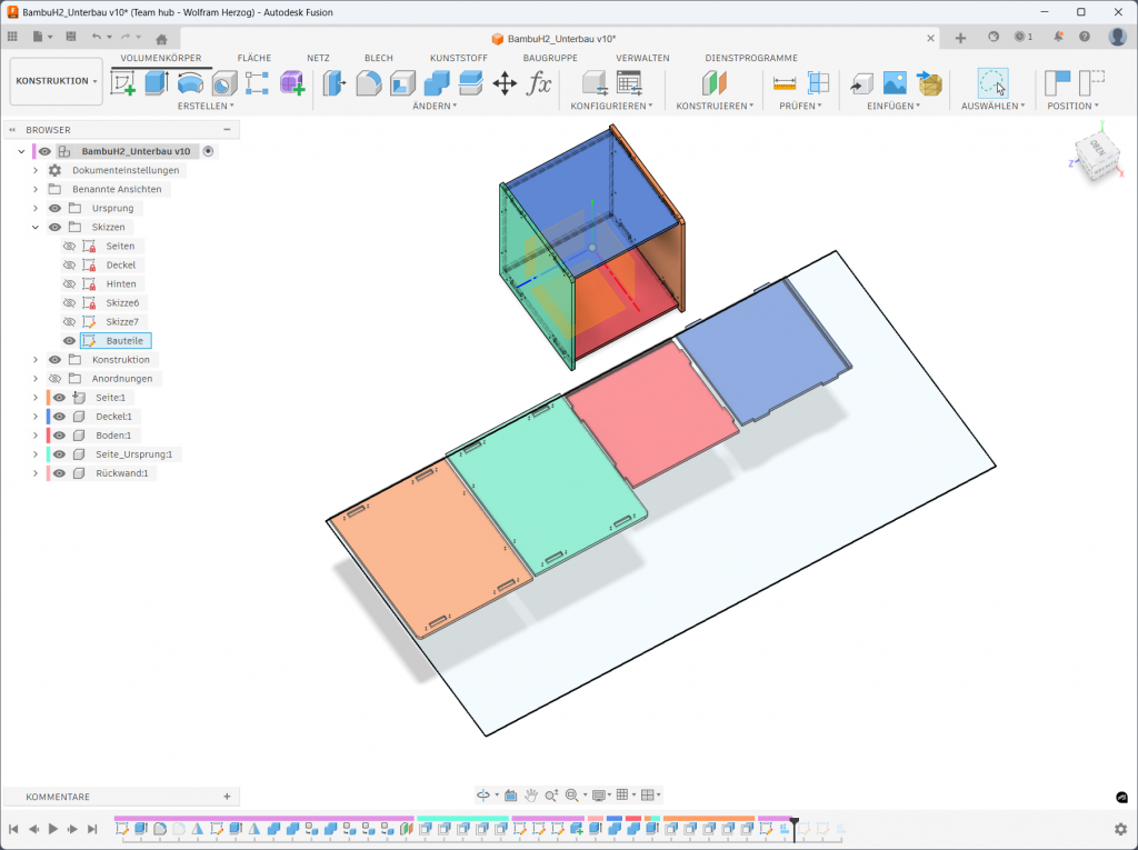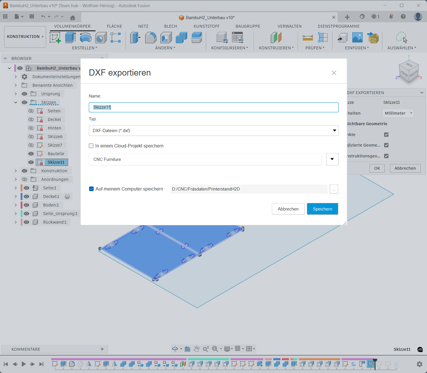 Ich habe diesen Artikel geschrieben, weil ich bisher noch nirgends eine brauchbare Erläuterung gefunden habe, wie man die Komponenten einer FUSION Möbelkonstruktion automatisch in einer Ebene anordnen kann. Das in vielen YouTube Videos üblicherweise gezeigte Vorgehen besteht darin, jede Komponente einzeln in eine Skizze zu projezieren und als DXF Datei exportieren. Das ist zwar einfach zu verstehen, aber sobald das Projekt etwas umfangreicher wird, ist diese Methode äußerst arbeitsintensiv und auch fehleranfällig.