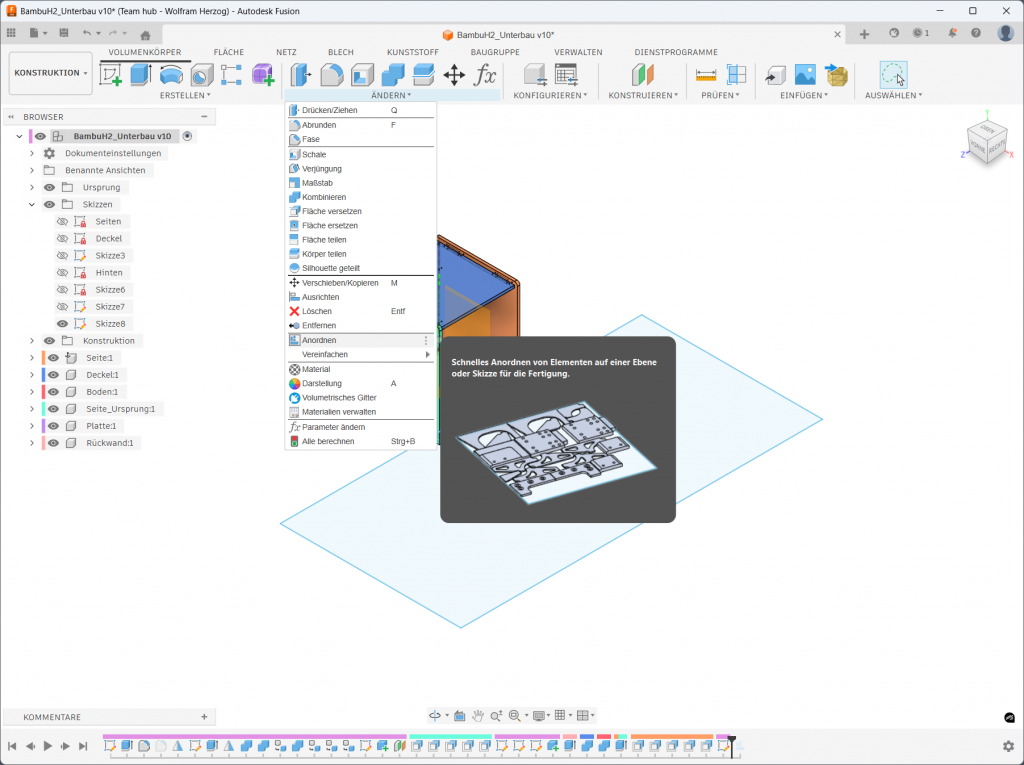 Die Skizze wird beendet und wir wechseln in die perspektivische Ansicht zurück. Jetzt wählen wir im Bereich „ÄNDERN“ den Menüpunkt „Anordnen“ aus