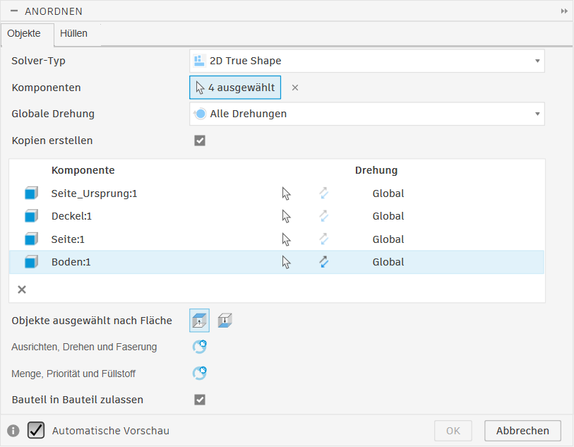 Da wir hier flache 2D Bauteile anordnen wählen wir als Solver-Typ die Option „2D True Shape“. Zudem wird der Haken „Kopien erstellen“ aktiviert, damit die ursprüngliche Konstruktion erhalten bleibt.