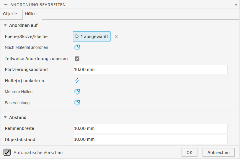 Nun klicken wir auf den Reiter „Hüllen“. Hier wird nun das Rechteck auf der zuvor angelegten Skizze ausgewählt, auf der die Komponenten angeordnet werden sollen.