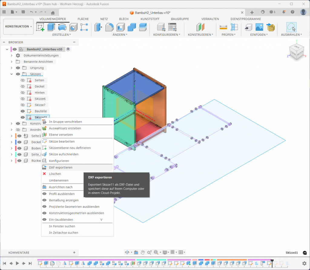 Jetzt muss man nur noch im Hierarchiebaum die soeben erzeugte Skizze mit einem Rechtsklick selektieren und kann mit der Option „DXF-Export“ den Inhalt der Skizze auf dem lokalen PC speichern.