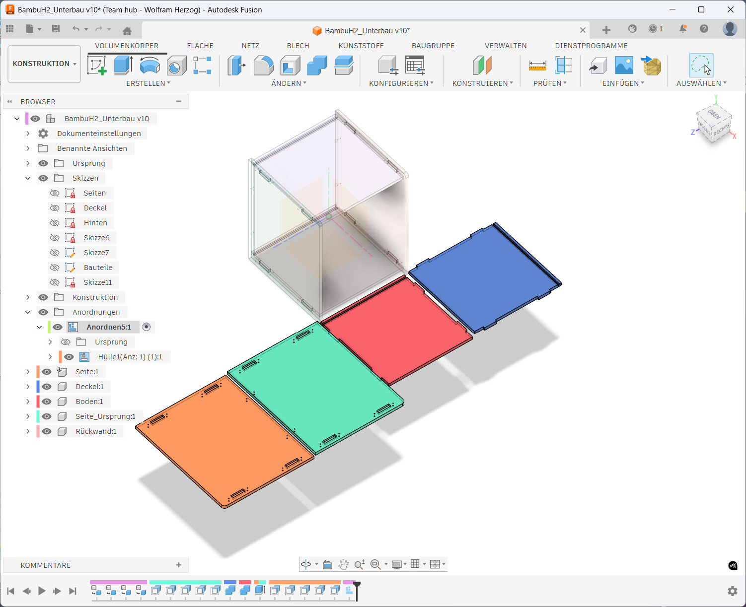 Mit dem Menüpunkt „Anordnen“ im Bereich „ÄNDERN“ ist so eine Anordung in FUSION aber recht schnell und einfach zu bewerkstelligen. Im nachfolgenden Beispiel zeige ich das Vorgehen beim Anordnen für den DXF Export anhand eines einfachen Schränkchens. Der verzapfte und verschraubte Korpus besteht aus insgesamt 4 Bauteilen (die im Jargon von FUSION als „Komponenten“ bezeichnet werden), die aus 18mm Multiplex gefertigt werden sollen.