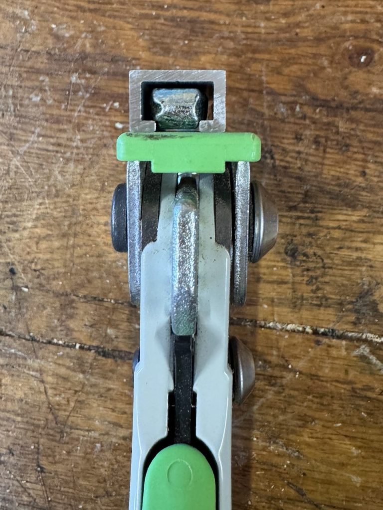 Da der Zwingenkörper im oberen Bereich V-förmig ausgebildet ist, neigt die Zwinge zum verkanten in der Nut. Zudem ist der Übergang am Zwingenkörper recht breit, d.h. in vielen Führungsschienen kann man die Zwinge nicht wirklich tief genug einschieben.