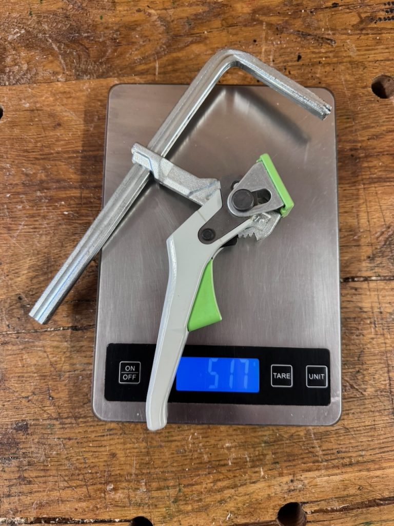 Wer Wert auf maximale Spannkraft legt und auch bei hohen Belastungen einen 100% sicheren Halt für die Führungsschiene sucht, der ist in meinen Augen mit der gezeigten Hebelzwinge am besten bedient. Das höhere Gewicht spielt da in meinen Augen nur eine untergeordnete Rolle.