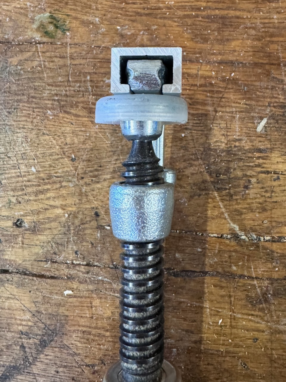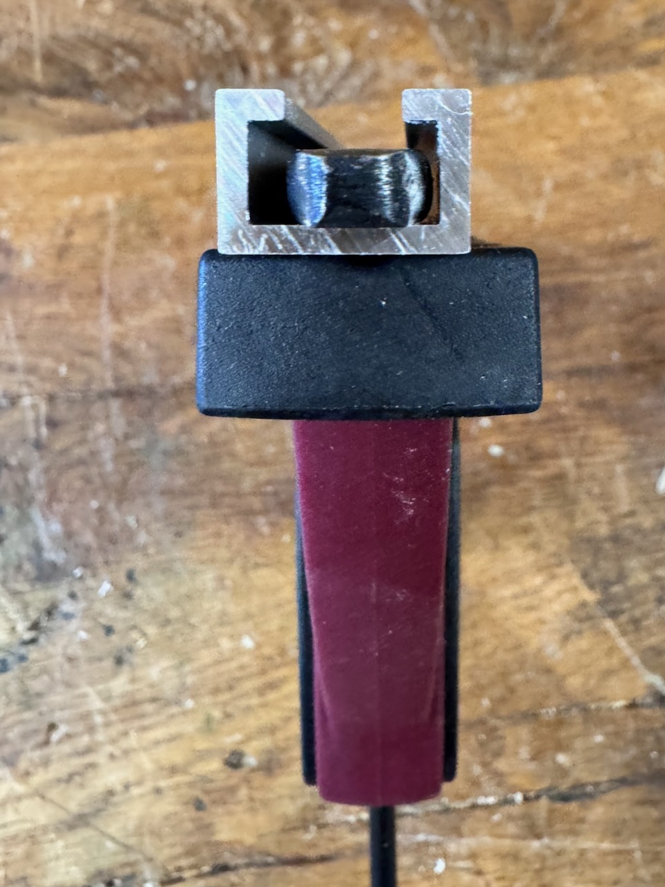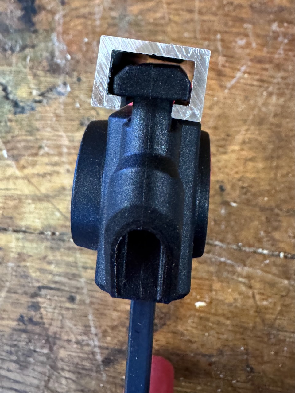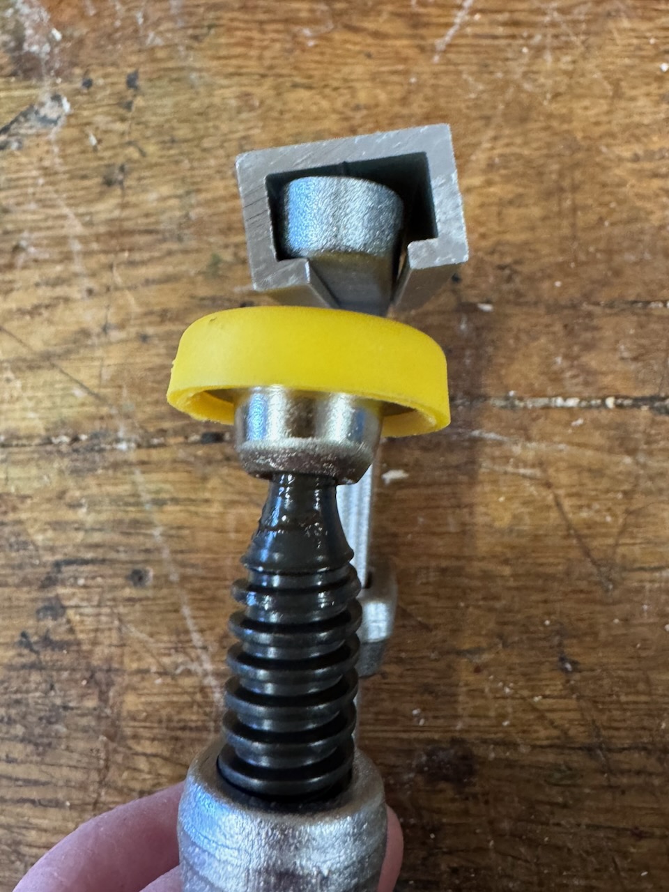 Da der Zwingenkörper im oberen Bereich V-förmig ausgebildet ist, neigt die Zwinge zum verkanten in der Nut. Zudem ist der Übergang am Zwingenkörper recht breit, d.h. in vielen Führungsschienen kann man die Zwinge nicht wirklich tief genug einschieben.