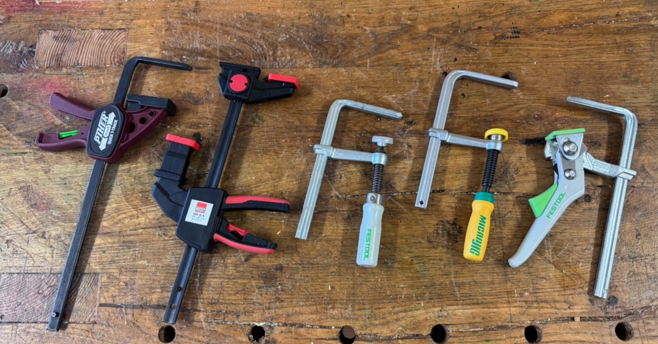Für ein präzises Arbeiten mit der Führungsschiene sind entsprechende Zwingen in meinen Augen Pflicht. Daher möchte ich hier einen kurzen Überblick geben, welche Zwingen sich da so im Laufe der Jahre bei mir in der Werkstatt angesammelt haben und wie ich diese bewerte.