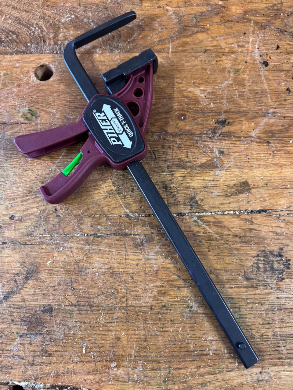 Durch Umstecken des Kopfes kann diese Zwinge auch als normale EInhandzwinge zum Einsatz kommen. Aufgrund der Universalität und der angenehmen Handhabung derzeit mein meistbenutzte Zwinge wenn es um das Sägen mit der Führungsschiene geht.