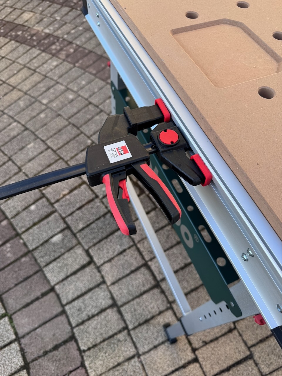 Hier ein Blick auf die MultiWerkBank und das mitgelieferte Zubehör. Die Einhandzwingen sind von guter Qualität und lassen sich angenehm bedienen. Sie können bei Bedarf auch zum spreizen verwendet werden.